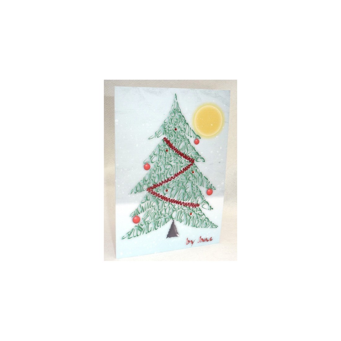 Vrolijk Kerstfeest! Een prachtige kerstboom kaart met het groen gemaakt volledig met kalligrafie. Glittery klatergoud cascades rond de boom en extra diamantes schitteren onder de rode ballen. De achtergrond is een prachtige besneeuwde dag scène met de zon schijnt de hele scherpe en zelfs 's ochtends.