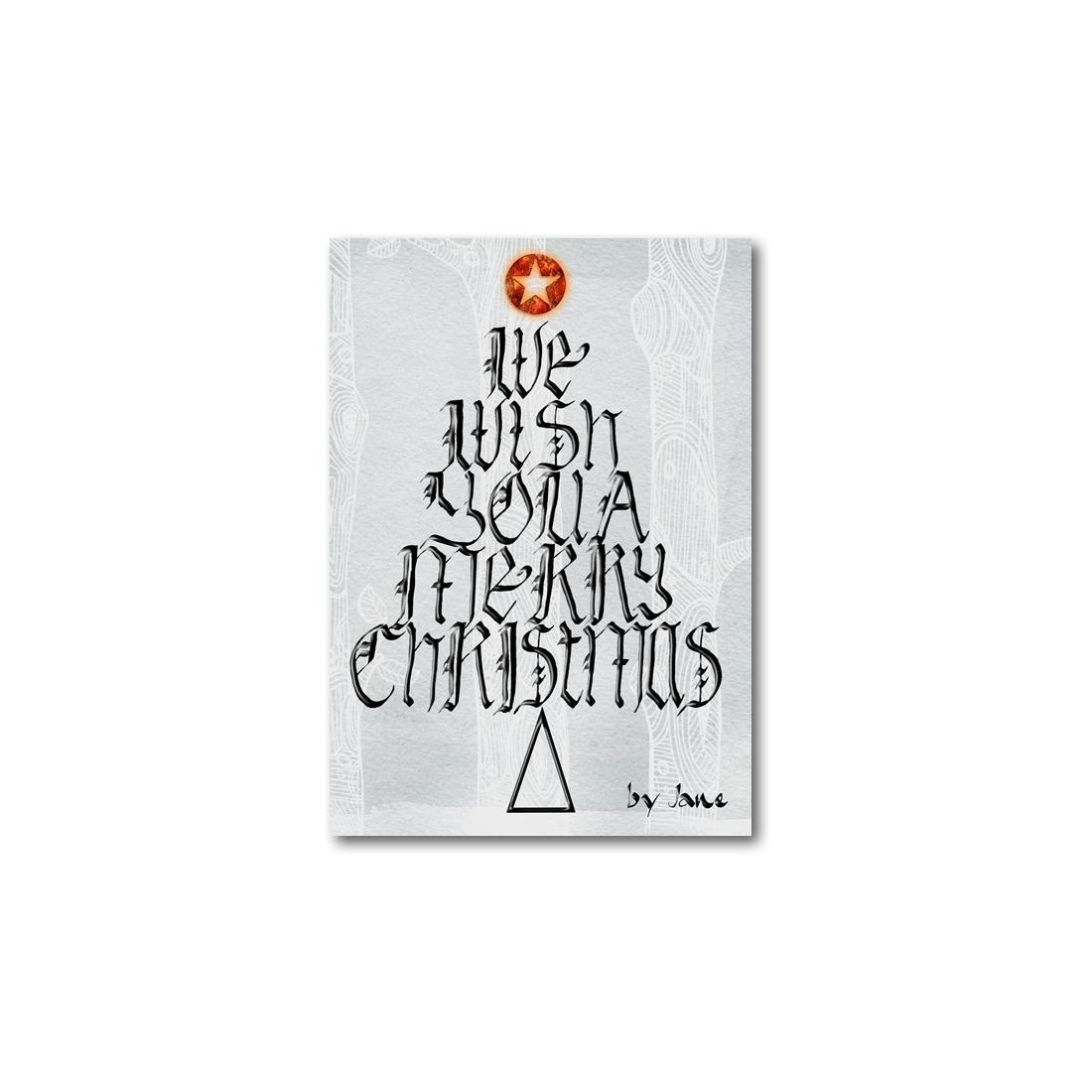 Wij wensen u een vrolijk kerstfeest. Een mooie kaart kalligrafisch dat die woorden heeft uitgekozen in een gotische stijl met een kerstboom in een winter bos vormen. Bekroond met een heldere rode Shining Star.