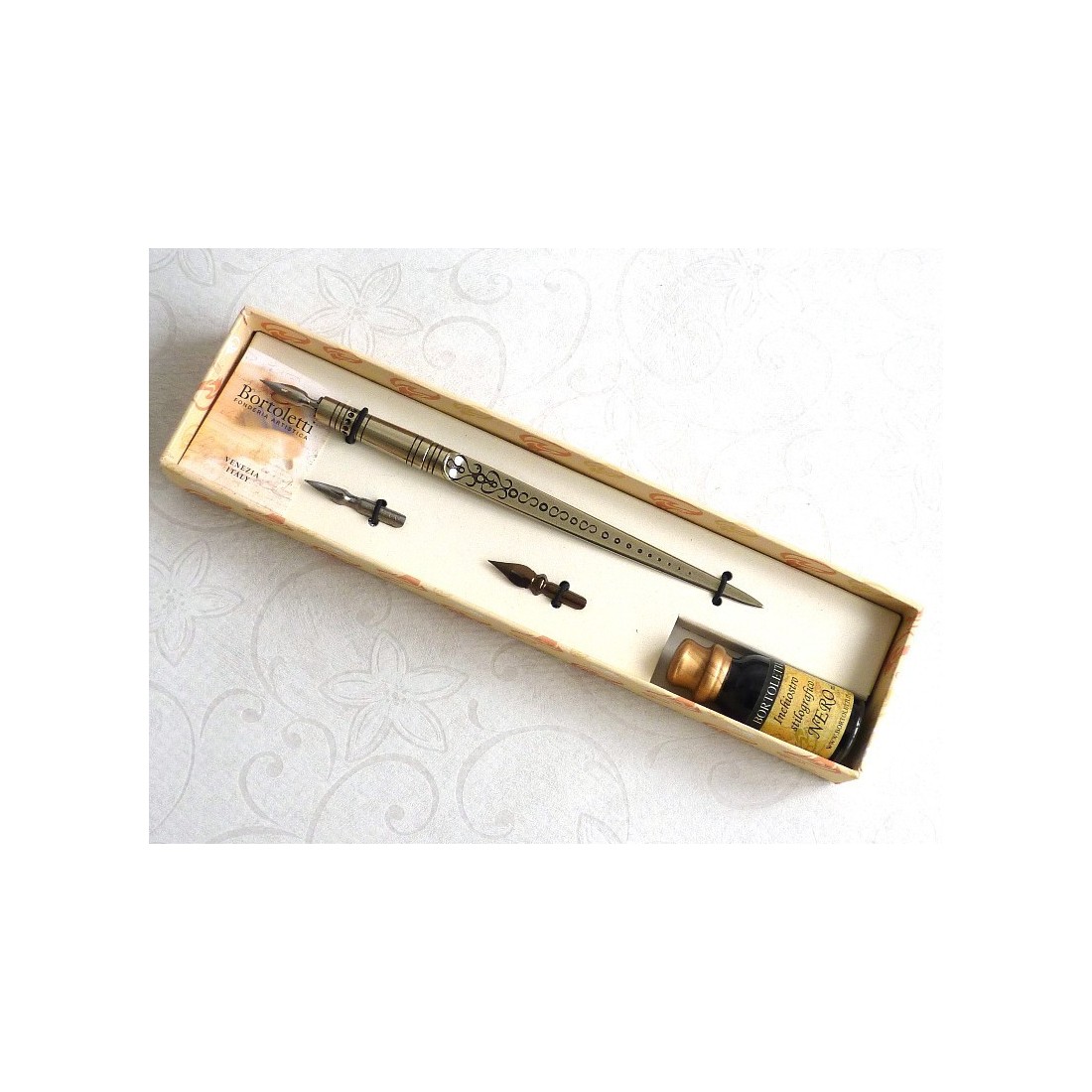 Briefopener en kalligrafie pen samen. Een ingenieus kalligrafiepen set, waar de nikkel zilveren pen prachtig is ingericht, het is ook een briefopener. Inclusief een flesje inkt. Vervaardigd in Italië door Bortoletti Fonderia Artistica.