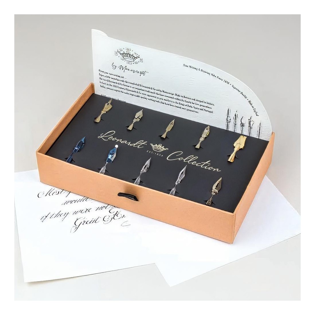 ManuscriptVictoriana NIB-collectie toont tien van de meest geliefde D. Leonardt & Co NIB's in een prachtig gedetailleerde presentatiedoos met gouden folie-accenten. Een perfecte inleiding tot de traditionele kalligrafie van dip-pen en een mooie verzamelaarset.