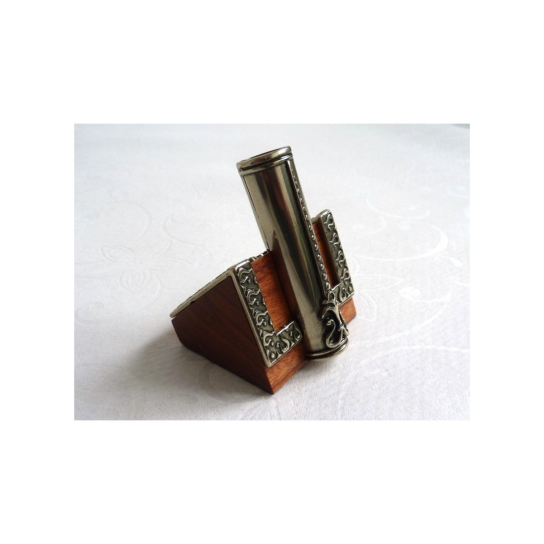 Veren ganzenveer, inktpot en penhouder. Deze set bestaat uit een kalligrafiepen van ganzenveren met bronzen penpunthouder verguld in nikkelzilver, inktpot en penhouder, een perkament met de geschiedenis van het schrijven en een penhouder. De nikkel-zilveren decoratie verrijkt de verenpen, de inktpot en de penhouder. Een elegant cadeau-idee. Ideaal om uw gedachten in stijl op te schrijven.