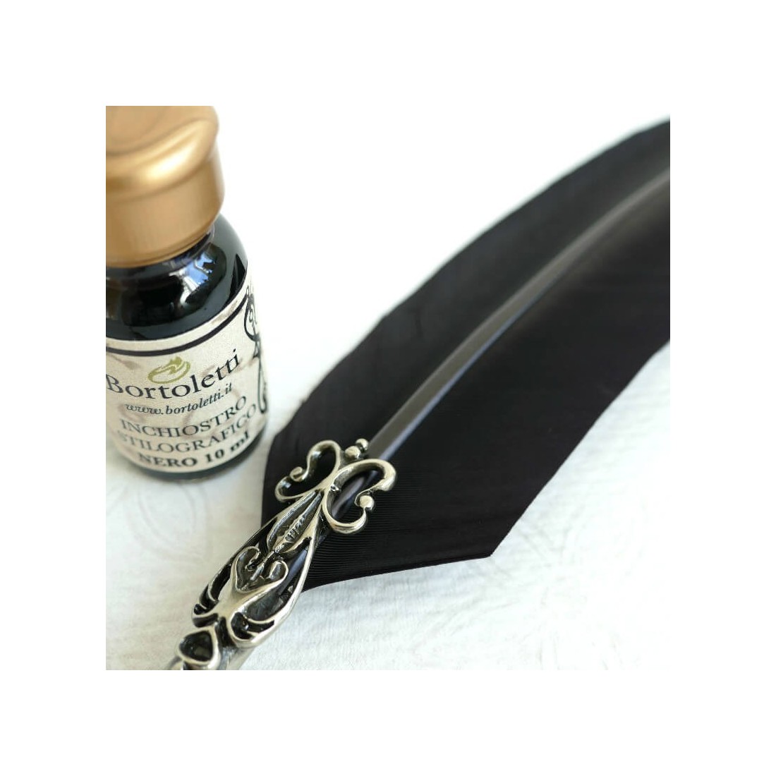 Een veer kalligrafie pen, twee tips en inkt. Deze set bestaat uit een gans kalligrafie pen met brons penpunt houder verguld in nikkel zilver, een standaard fles inkt en twee antieke tips. Vervaardigd in Italië door Bortoletti Fonderia Artistica.