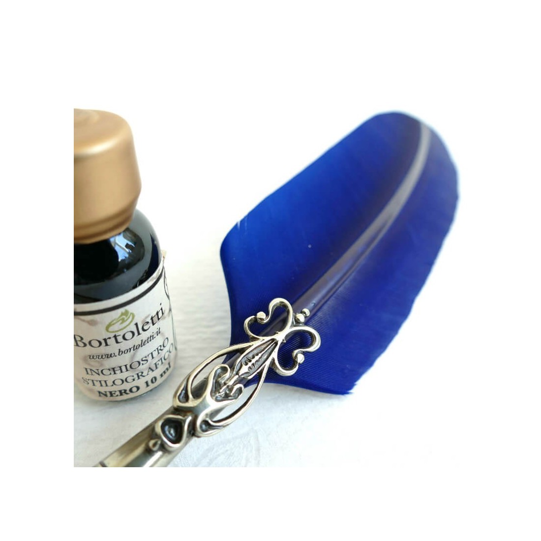 Een veer kalligrafie pen, twee tips en inkt. Deze set bestaat uit een gans kalligrafie pen met brons penpunt houder verguld in nikkel zilver, een standaard fles inkt en twee antieke tips. Vervaardigd in Italië door Bortoletti Fonderia Artistica.