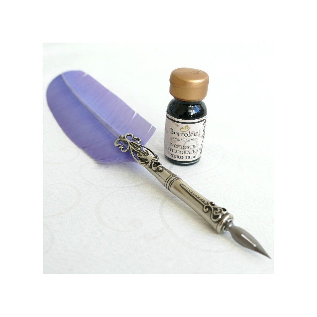 Een veer kalligrafie pen, twee tips en inkt. Deze set bestaat uit een gans kalligrafie pen met brons penpunt houder verguld in nikkel zilver, een standaard fles inkt en twee antieke tips. Vervaardigd in Italië door Bortoletti Fonderia Artistica.