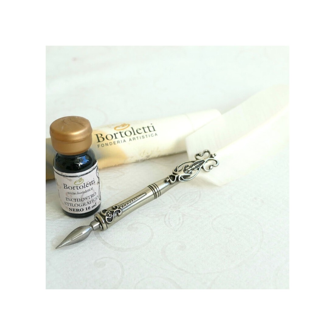 Een veer kalligrafie pen, twee tips en inkt. Deze set bestaat uit een gans kalligrafie pen met brons penpunt houder verguld in nikkel zilver, een standaard fles inkt en twee antieke tips. Vervaardigd in Italië door Bortoletti Fonderia Artistica.
