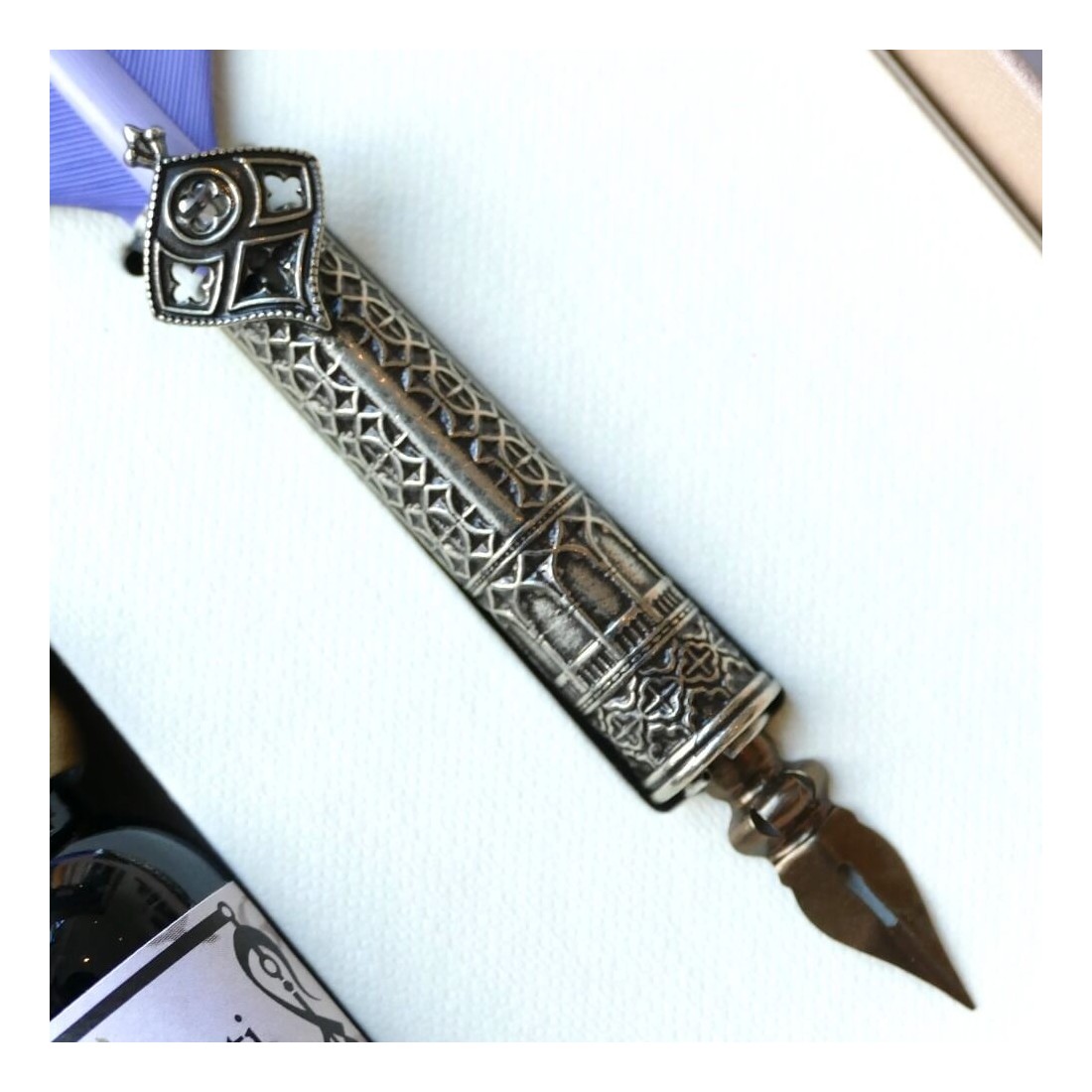 Veer kalligrafie pen en inkt. Deze set bestaat uit een gouden veer kalligrafie dip pen met brons nib houder geplateerd in nikkel zilver en een standaard fles inkt. De nikkel zilveren decoratie verrijkt de veerpen. Een elegant cadeau idee.