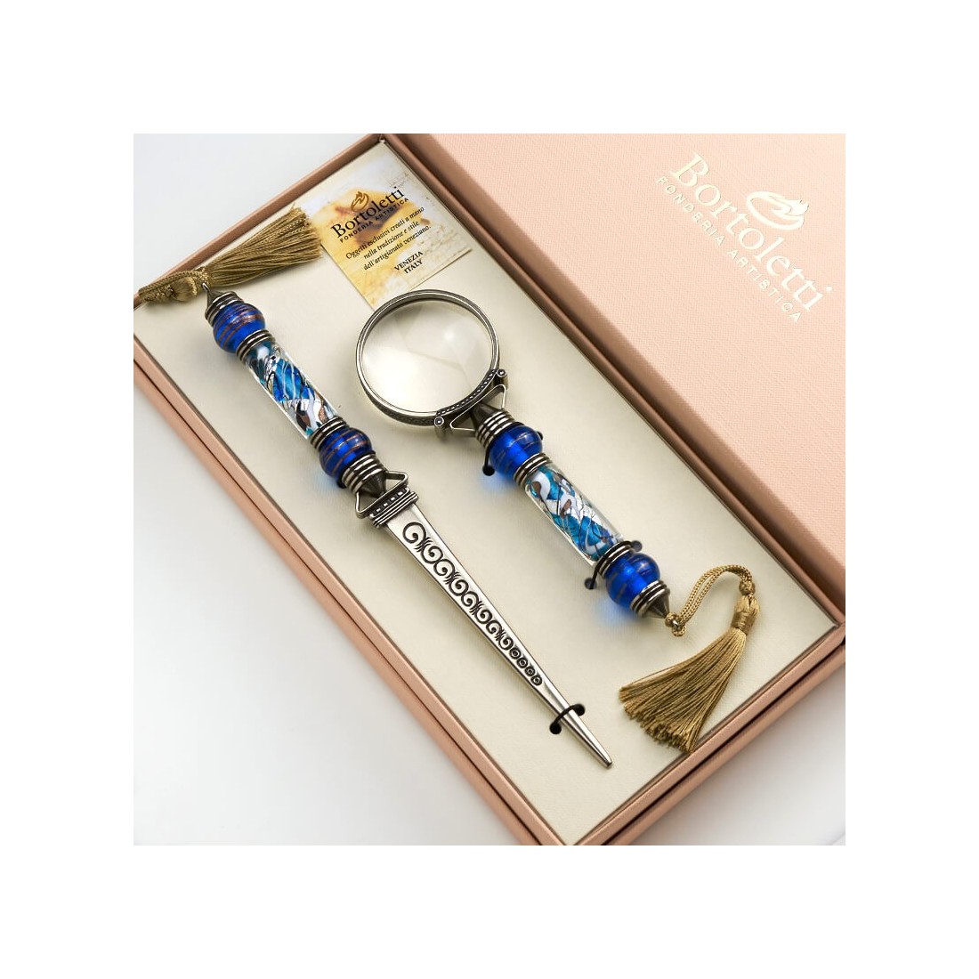 Brevöppnare och förstoringsglas. Användbara föremål och dekorativa element som ser fantastiska ut på ditt skrivbord. De är gjorda av nickelsilver med Murano-glas som innehåller silverblad. Komplett med guldflätade tofsar. Den gammaldags designen och vården av dessa föremål talar för sig själva.