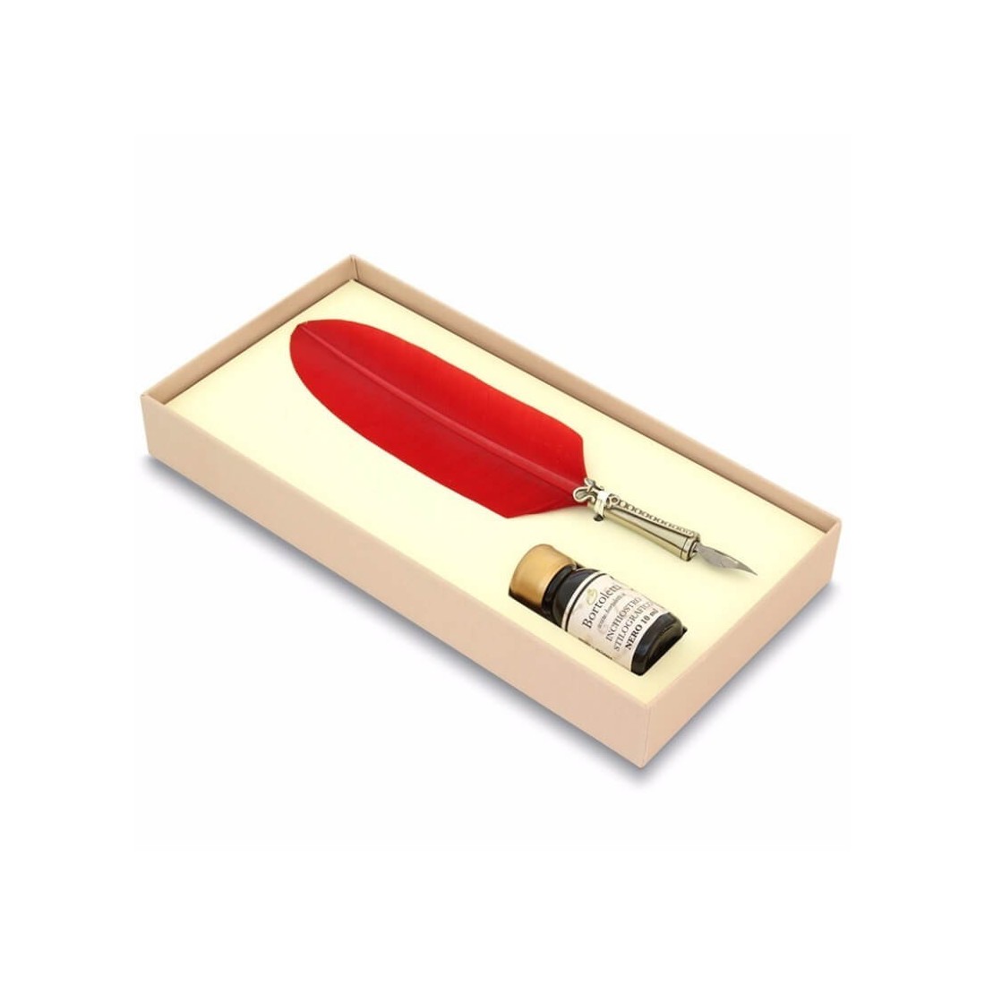 Gåsfjärring kalligrafi penna och bläck. Denna uppsättning består av en gåsfjäril kalligrafi-penn med bronsnibshållare pläterad i nickelsilver och en vanlig flaska bläck. Tillverkad i Italien av Bortoletti Fonderia Artistica.