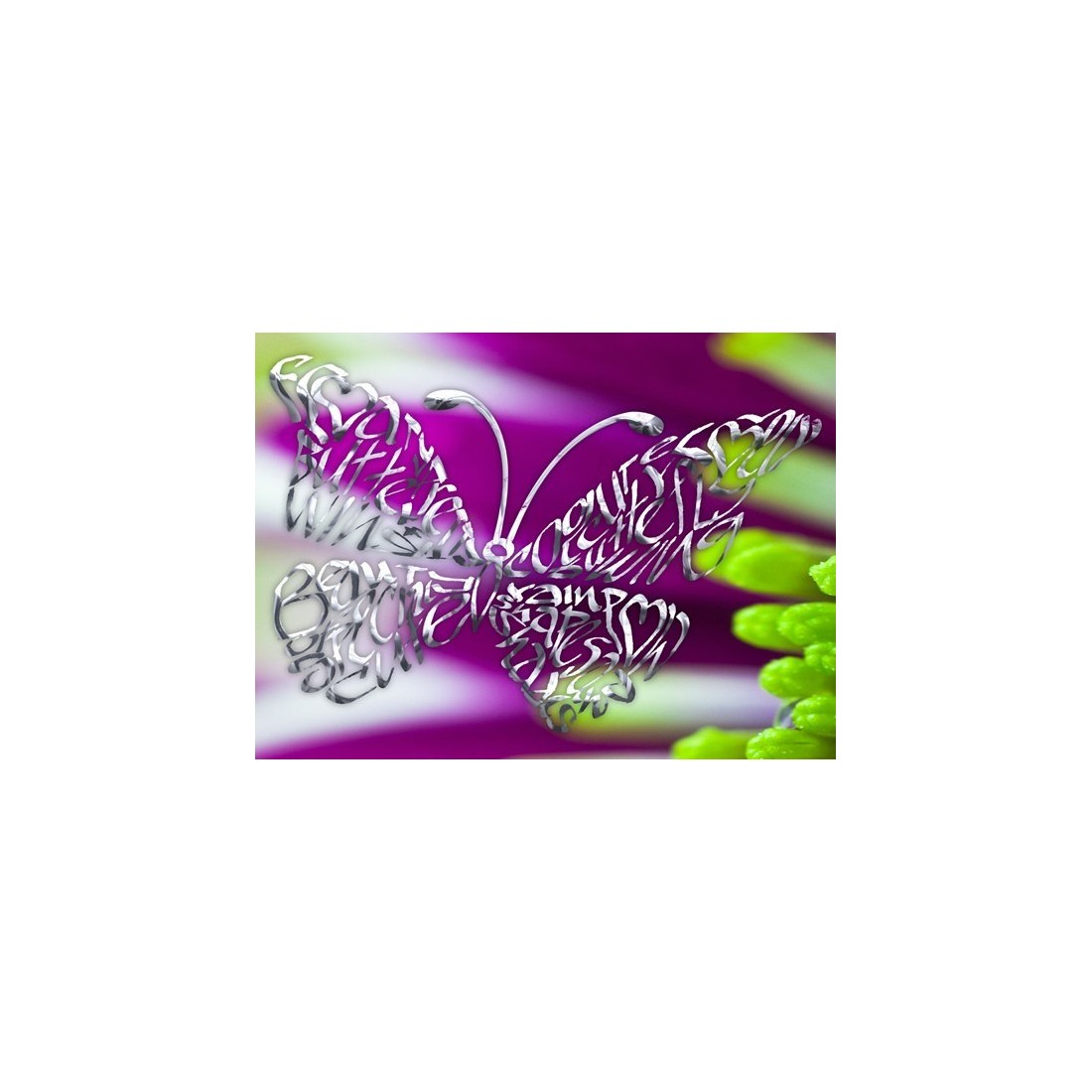En vacker krom effekt fjärilen utformad i ord närmar sig en lila blomma. Denna underbara fjäril design speglar den delikat skönheten av våra bevingade sommarträdgård vänner. Unikt, original och väldigt annorlunda från våra vanliga gratulationskort.