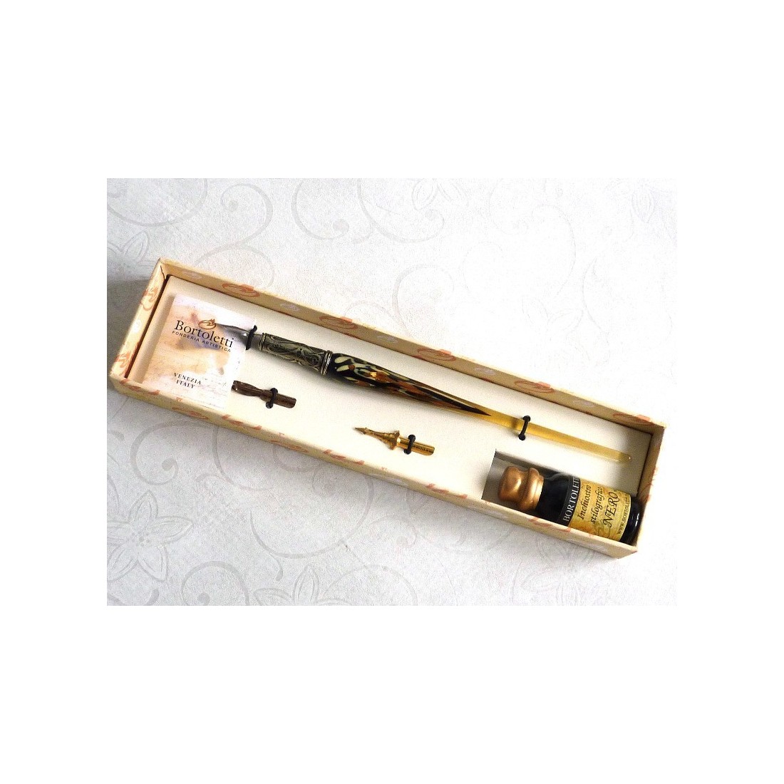 Bladguld och glas penna set. En vackert utformad, hand klar kalligrafi doppa penna set, som består av en Murano glas penna med bladguld flingor, tre spetsar och en flaska bläck. Finns i en rad underbara färger. Tillverkad i Italien av Bortoletti Fonderia Artistica.