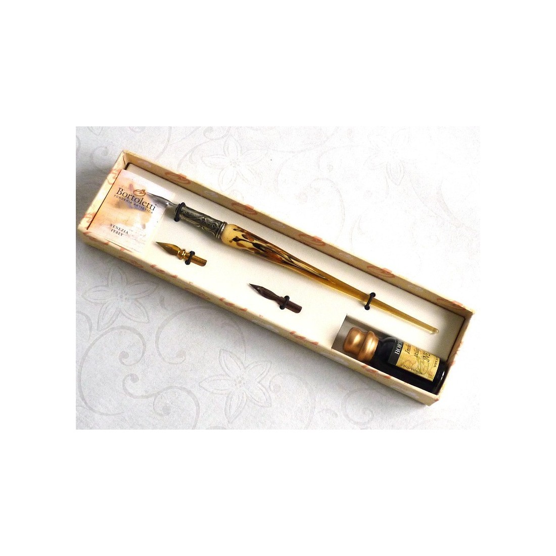En vackert utformad, handen klar kalligrafi dopp penna set, som omfattar en Muranoglas penna med bladguld flingor, tre spetsar och en flaska bläck. Finns i en rad härliga färger.