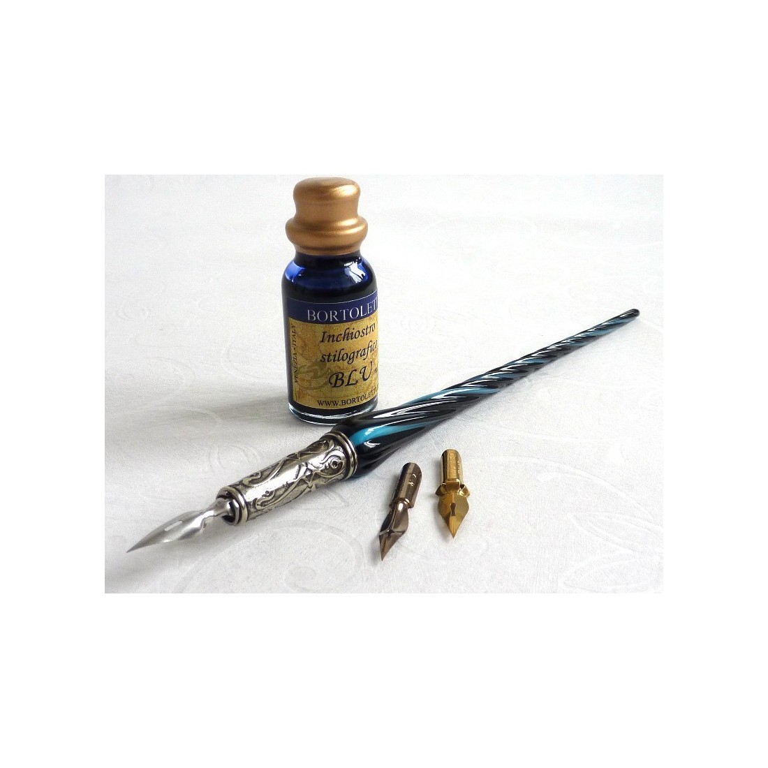 En venetiansk vriden glaspenna. Vackert utformad, hand klar kalligrafi penna som för dem som älskar stil och elegans i Venedig. Innefattar en vriden glas axel med en nickel-silver penna, tre spetsar och en flaska bläck. Finns i olika färger. Tillverkad i Italien av Bortoletti Fonderia Artistica.