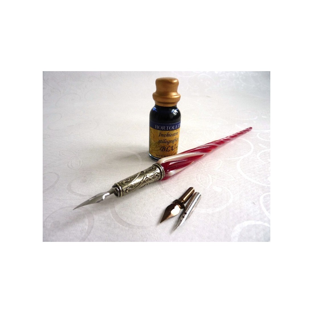 En venetiansk vriden glaspenna. Vackert utformad, hand klar kalligrafi penna som för dem som älskar stil och elegans i Venedig. Innefattar en vriden glas axel med en nickel-silver penna, tre spetsar och en flaska bläck. Finns i olika färger. Tillverkad i Italien av Bortoletti Fonderia Artistica.