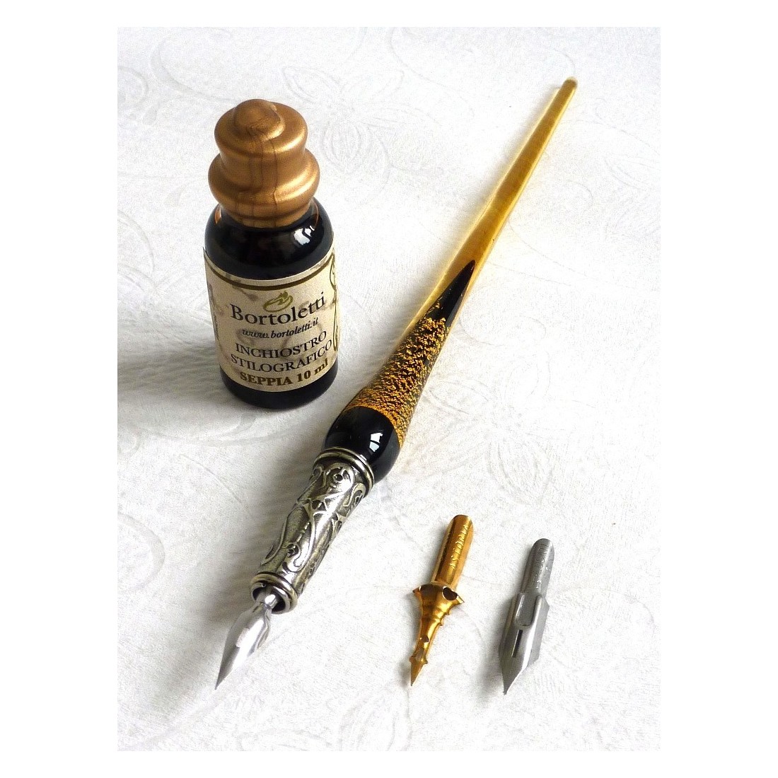En vackert utformad, handfärdig, kalligrafi dopppennsats. Innehåller en Murano-glaspenna med bladguldflingor, tre spetsar och en flaska bläck. Finns i en rad underbara färger.