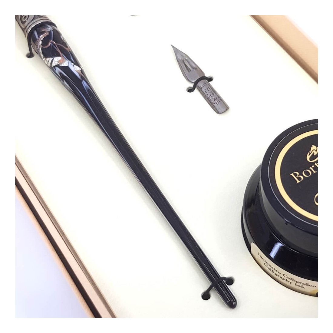 Ett vackert utformat, handgjordt kalligrafi-doppningsset, som består av en Murano-glaspenna med silverbladsflingor, tre spetsar och en flaska bläck.