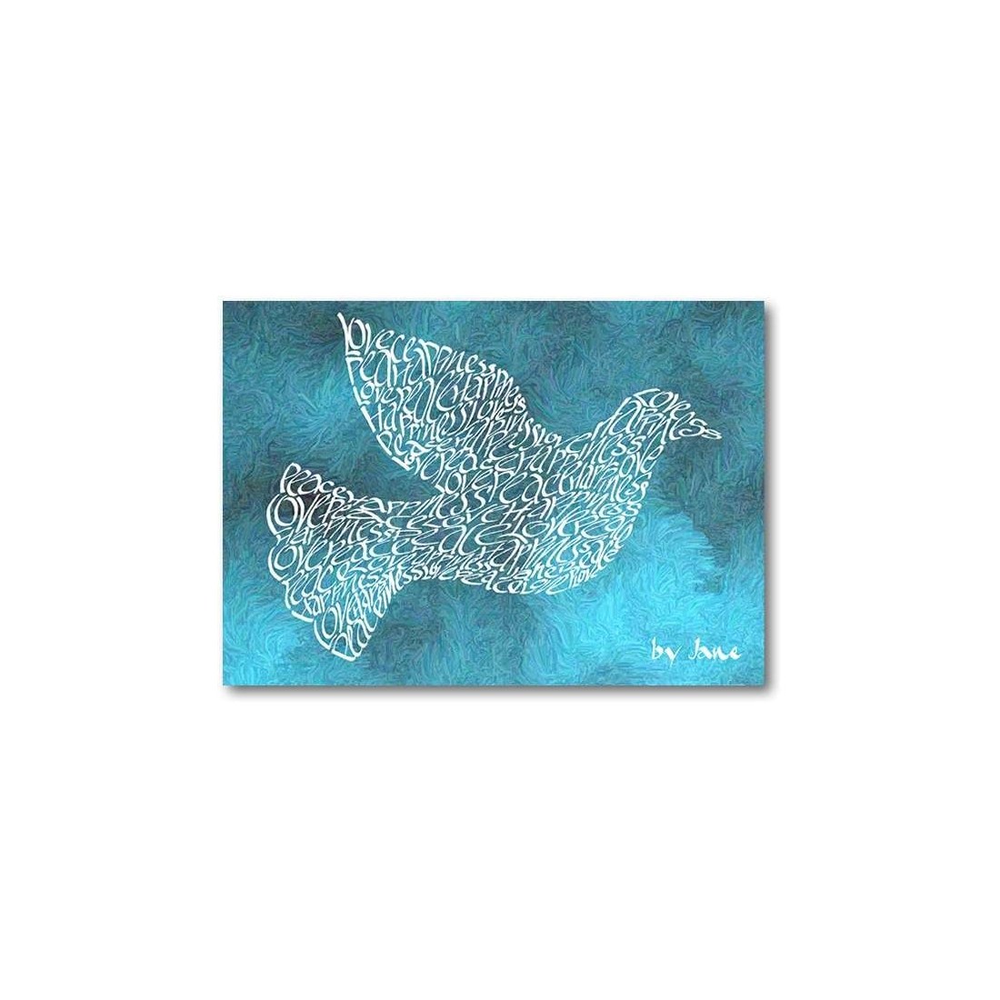 Duvan av fred är känd världen över. Så varför inte skicka dina fredliga tankar till en vän med denna vackra kalligrafiska kort? En vit duva på en virvlande blå / grön impressionistisk bakgrund. Diamantes placeras endera sidan av "Jane".