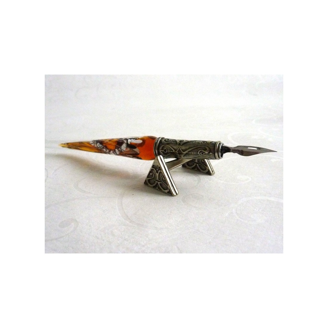En bekväm säng för din älskade penna, tillverkad i fint arbetade nickle silver. En liten pärla av design och hantverk, är denna penna vila unika.