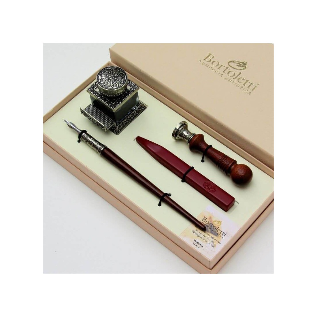 Todaros kalligrafi-set är ett av flaggskeppen i Bortoletti-kollektionen, och det är lätt att förstå varför. Pennan är gjord av högkvalitativt trä och pennhållaren är gjord av handarbetad vit brons. Sigillen är också gjord av trä, och den kommer med en mängd olika utbytbara bokstäver och symboler.